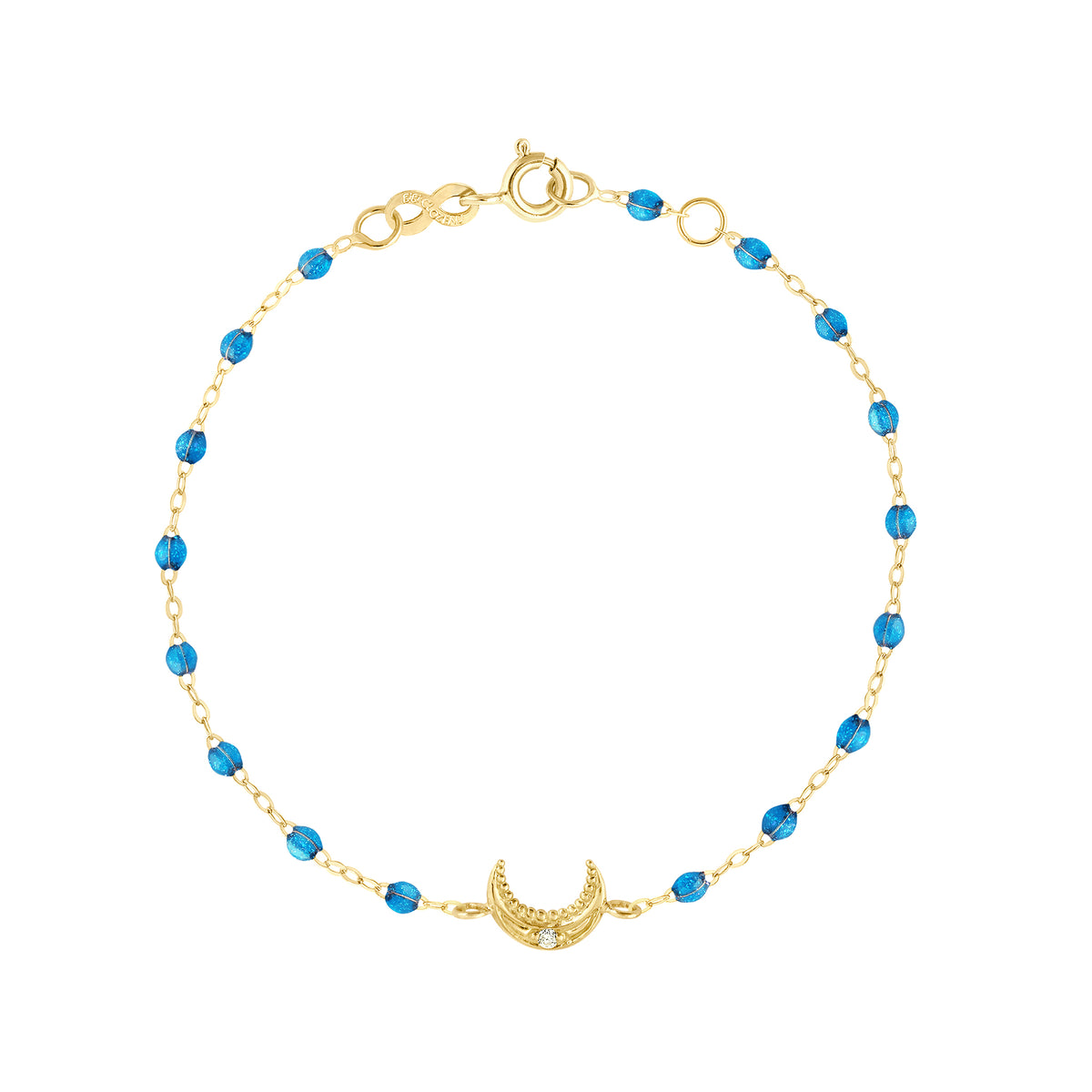 La nuit tombée, la lune Gigi brille discrètement dans le ciel étoilé. L'étoile gigi, la lune, la clé, l'étoile de David… Voici les trésors de la collection "pirate". Des bijoux découverts dans le coffre-fort d'un navire. Bracelet Lune, 1 diamant, or jaune 18 carats et élégantes perles de résine couleur azur.