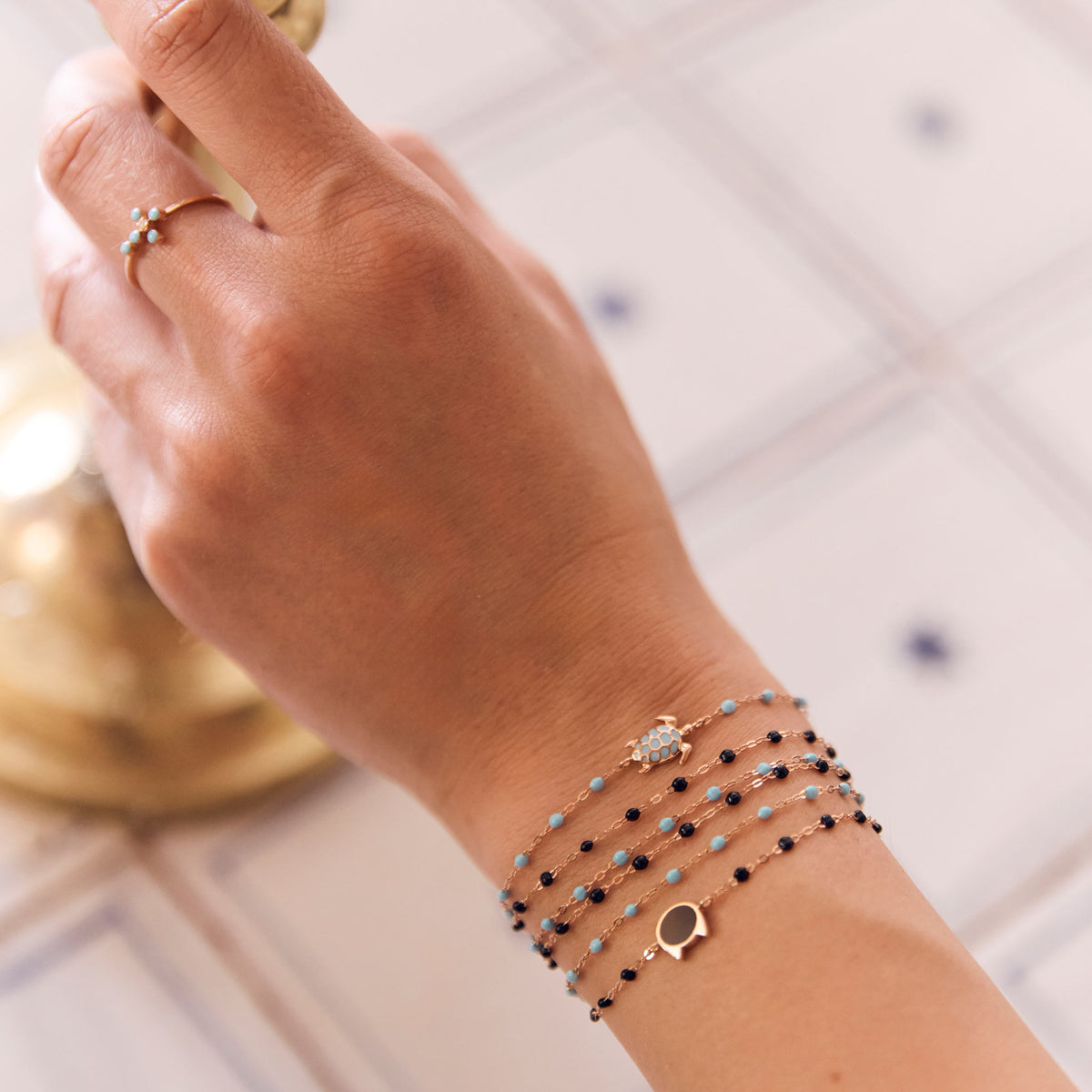 Photo de la main d’une femme portant différents bracelets Gigi Clozeau aux couleurs turquoise et noires.