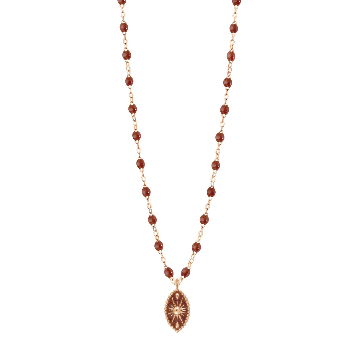 Le Collier Karma gigi Clozeau en or rose 18 carats se dévoile sur la chaîne classique gigi, ponctuée d’élégantes perles de résine moka. Son pendentif au contour finement perlé incarne un talisman précieux, à la fois protecteur et lumineux.