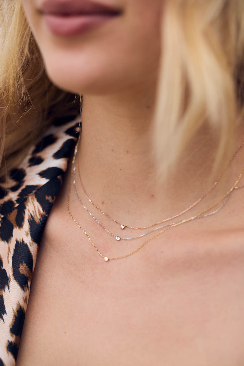 The Pure Dot collection reveals minimalistic elegance. A thin, gold chain, highlighted by a central diamond, available in three golds that play on subtle nuances. Wear it alone to enhance every moment, or layer it for a naturally luminous look.