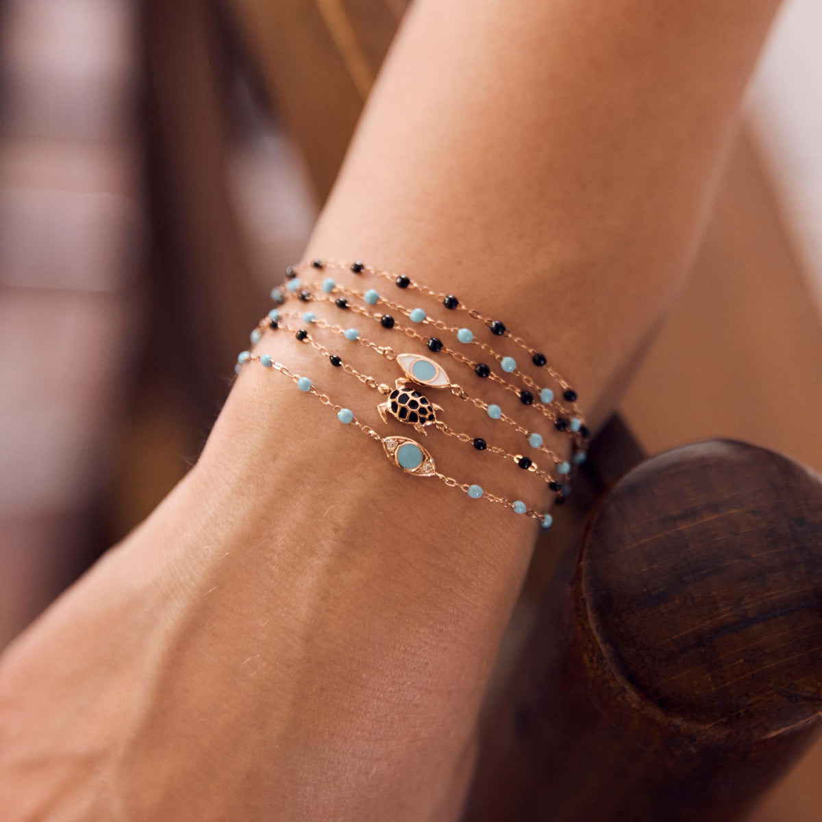 Photo de la main d’une femme portant différents bracelets Gigi Clozeau aux couleurs turquoise et noires.